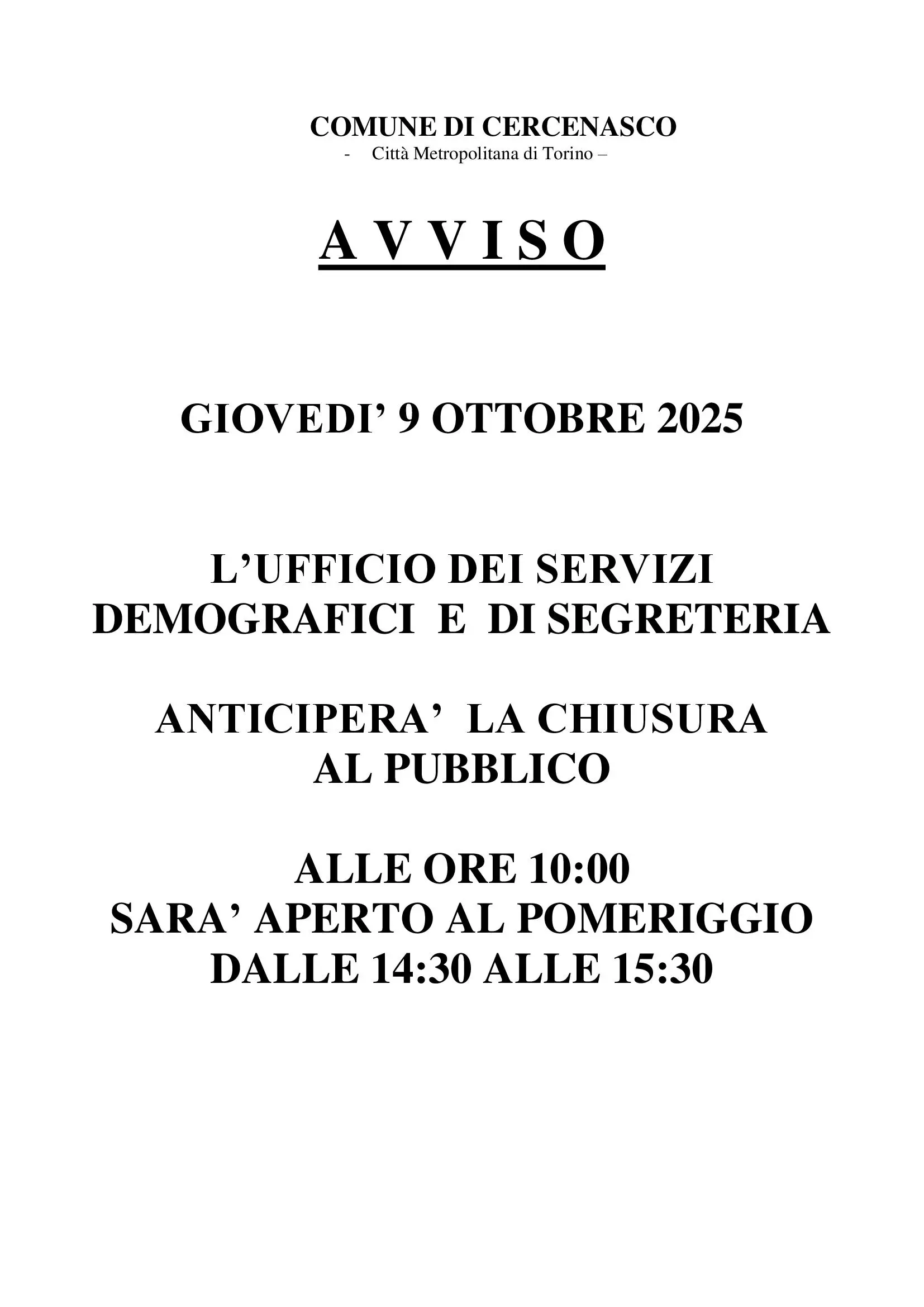 Descrizione L’UFFICIO DEI SERVIZI DEMOGRAFICI E DI SEGRETERIA ANTICIPERA’ LA CHIUSURA AL PUBBLICO ALLE ORE 10:00 SARA’ APERTO AL POMERIGGIO DALLE 14:30 ALLE 15:30